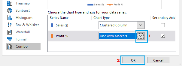 This will add a secondary axis to the existing bar chart and you will end up with two overlapping bars. 5. Now, right-click on the Profit margin bar and select Change Series Chart Type option. 6. In Change Chart Type dialog box, change the Profit Margin Chart type to Line with Markers. 7. Click on OK to save the changes. You will now have a Bar Chart with a Primary Axis representing Sales Data ($) and a Secondary Axis representing Profit Margins (%).
