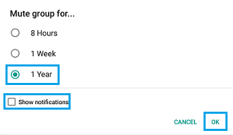 6. Tap on OK to disable notifications for a period of 1 Year.